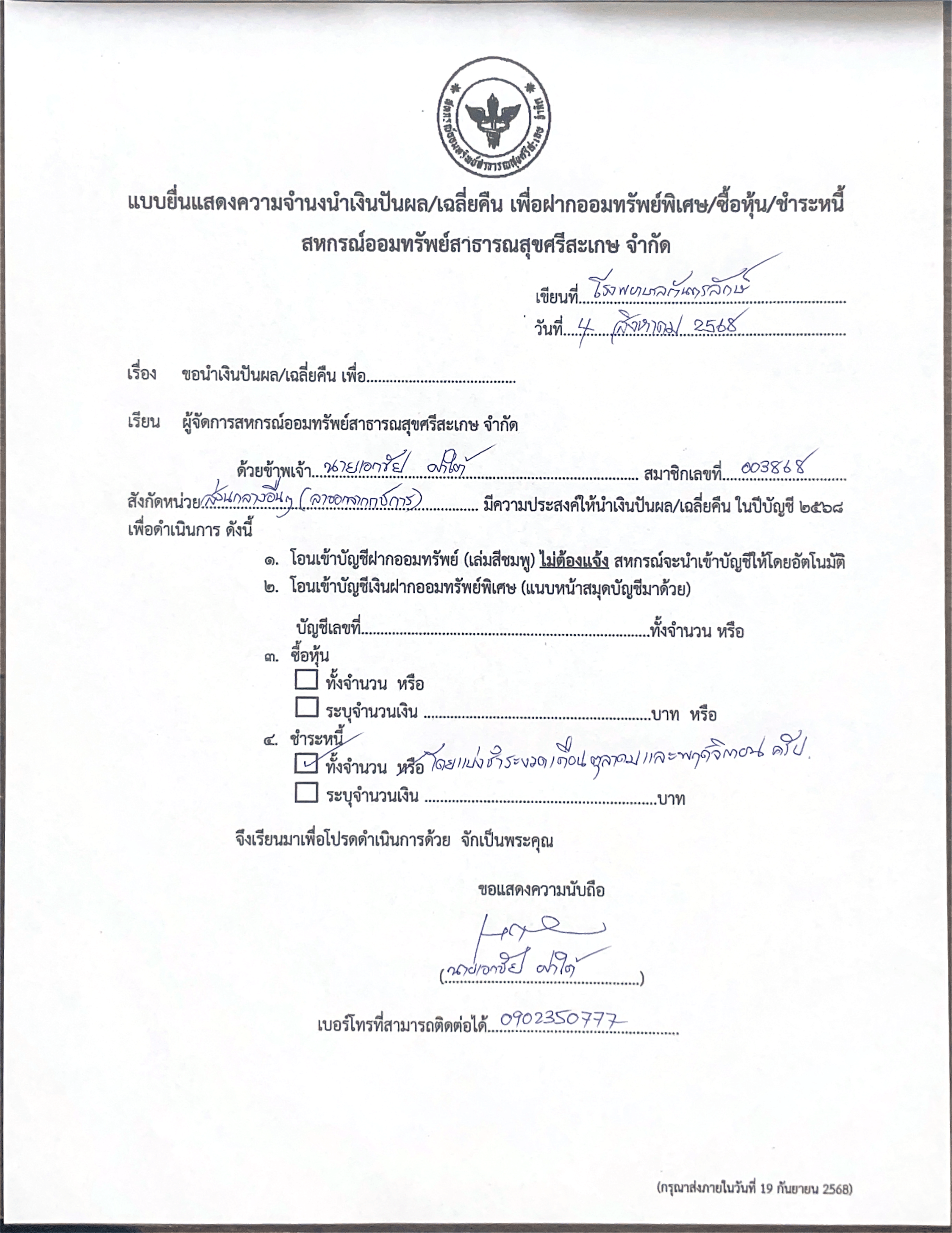 8/1/2025 3:00 PM 255039 แบบยื่นแสดงควสามจำนงนำเงินปันผลเฉลี่ยนคืน เพื่อฝากเล่มฟ้า.pdf